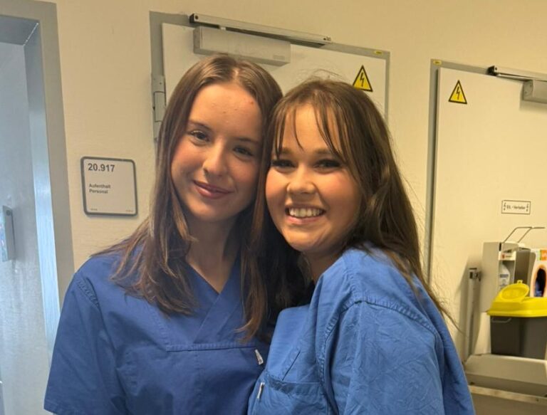 Marc und Lara, unsere Corporate Influencer*innen, durften selbst mitmachen: beide haben zum Beispiel für den Dreh ausgiebig die pädiatrischen Skills Labs getestet. Und schon in den Skills Labs sind die ersten lustigen Szenen entstanden. Bei Lara und Marc, die selbst frisch examinierte Pflegefachpersonen sind, wurden dabei natürlich auch jede Menge Erinnerungen aus der eigenen Ausbildungszeit wach.