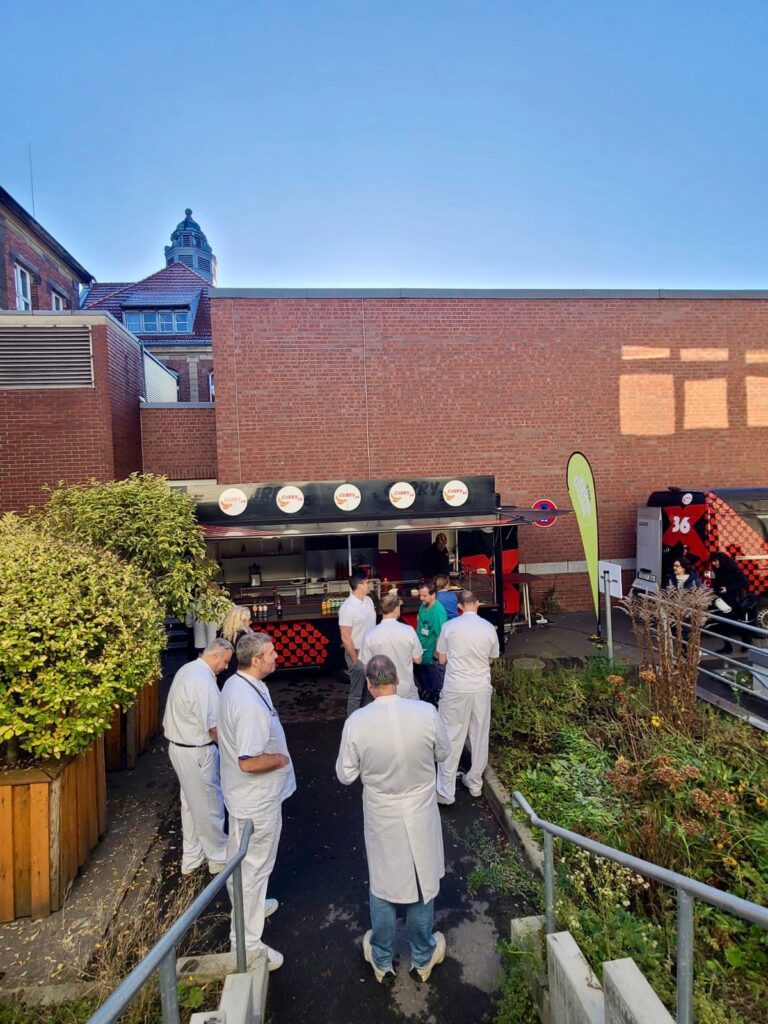 Dann ging es an die konkrete Planung: Dazu gehörte die Terminabstimmung mit dem Foodtruck und ich musste intern alles genehmigen lassen. Meine Pflegedienstleitung hat sich total für mein Team gefreut und so hat alles ganz unkompliziert funktioniert. Bereits am Freitag rollte der stylische schwarze Curry-36-Foodtruck an und stand pünktlich ab 12 Uhr bei uns vor der Tür.